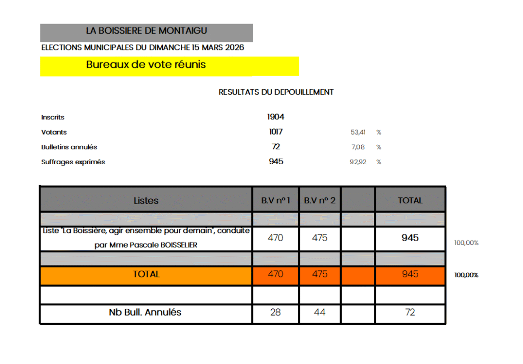 À l’issue des votes, la liste “La Boissière, agir ensemble pour demain” a été élue avec 100% des suffrages exprimées.