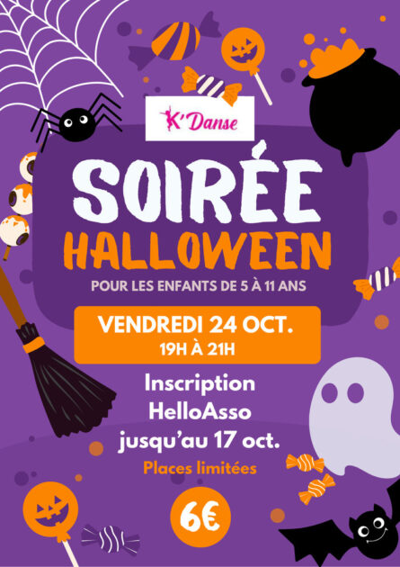 K’Danse organise une Soirée Halloween de 19h à 21h pour les enfants de 5 à 11 ans, le vendredi 24 octobre 2025 à la salle du Foyer Soleil.